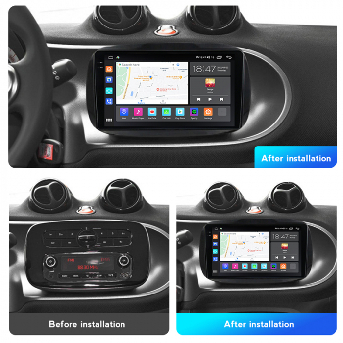Navigatie Smart Fortwo din 2015-2020 Android 14 , 4GB RAM , Procesor Quad Core , Wireless Carplay si Android auto , Display HD Touchscreen, Wi-Fi , Bluetooth, USB + CADOU