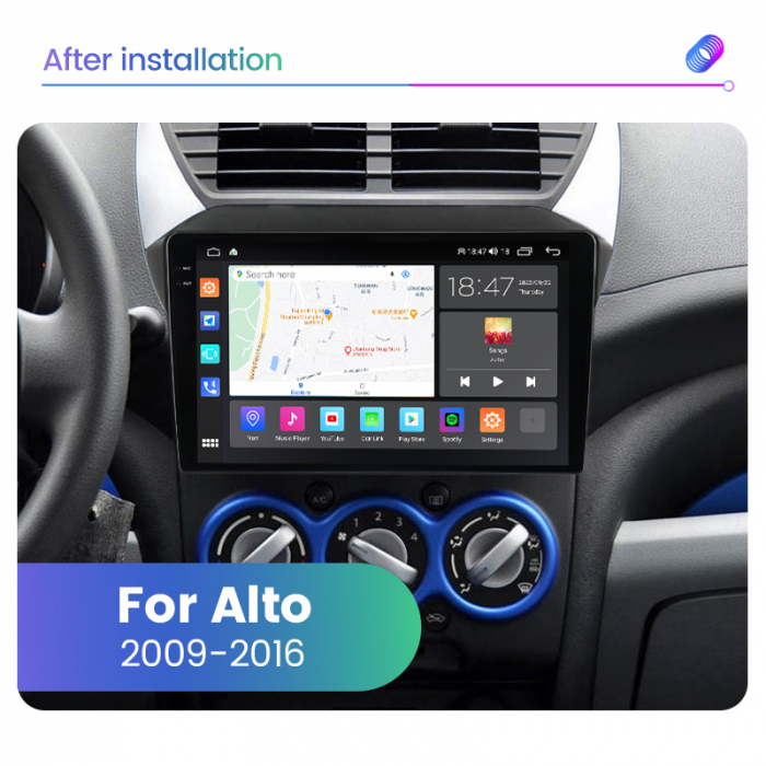 Navigatie Suzuki Alto din 2009-2016, Rezolutie 2K, Display QLED 9.5 inch, 4GB RAM si 64GB ROM, Android, Procesor Octacore, Slot sim 4G, Sunet DSP, Wireless Carplay si Android Auto, Camera Marsarier, U